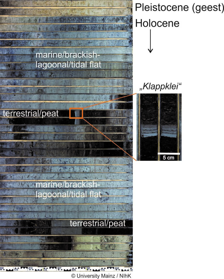 The mapping is based on stratigraphic records from the archives of the State Authority for Mining, Energy and Geology, as well as newly collected field data. Sediment samples from the coastal Holocene are extracted using core drilling methods and analysed for typical storm surge deposits (fig. 2). These are clastic sediments embedded in peat, referred to as Klappklei (fig. 3). Radiometric and luminescence dating methods provide chronological context and help to reconstruct the coastal development. The resulting sedimentological data are then correlated with each other and with geophysical data, such as geomagnetics and ground-penetrating radar. This integrated approach allows for the creation of detailed paleo-landscape reconstructions, offering deeper insights into natural coastal dynamics — an essential foundation for future sustainable and nature-based coastal protection strategies.